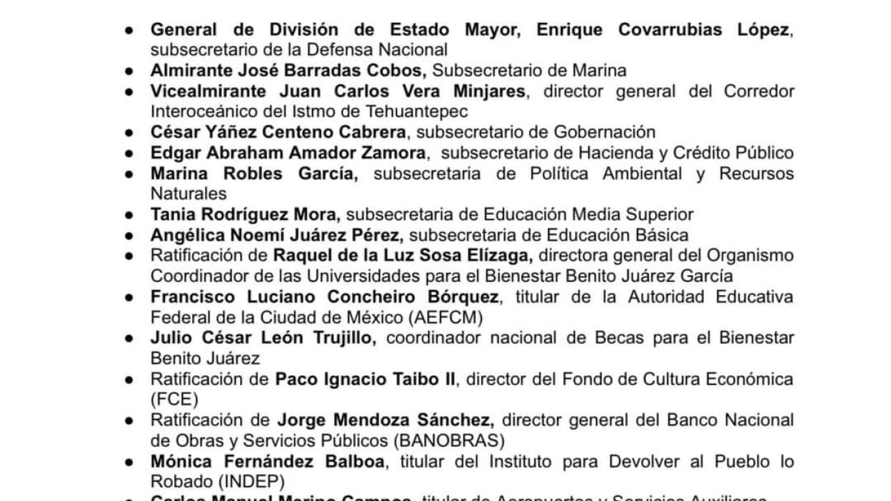 Seis de los puestos anunciados son ratificaciones de funcionarios y funcionarias del gobierno de López Obrador.