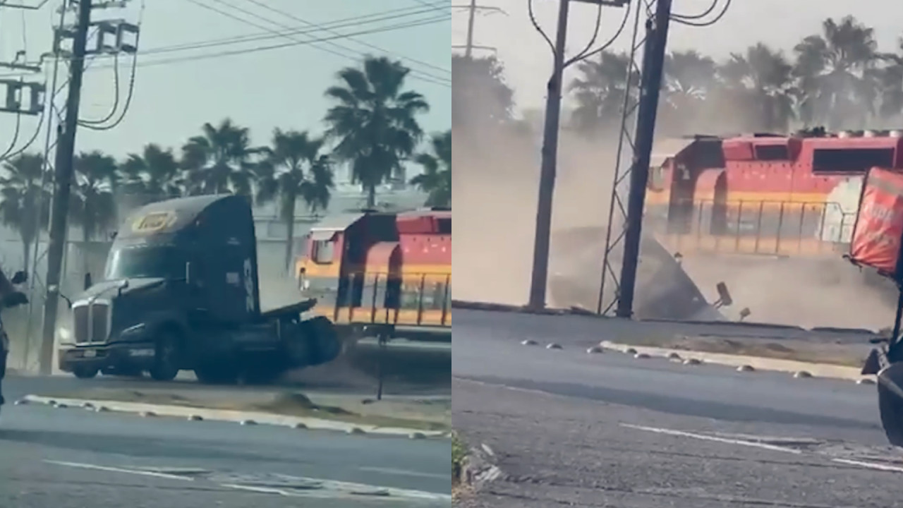 Un tráiler que presuntamente intentó ganarle el paso a un tren fue embestido en el cruce de la avenida Parque Industrial Monterrey y 7ª avenida, en Apodaca, Nuevo León, este viernes 21 de noviembre.