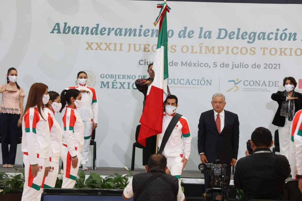 Rommel Pacheco y Gabriela López recibieron el lábaro patrio de manos de Andrés Manuel López Obrador, presidente de México, rumbo a los Juegos Olímpicos de Tokio, los cuales se realizarán del 23 de julio al 8 de agosto.