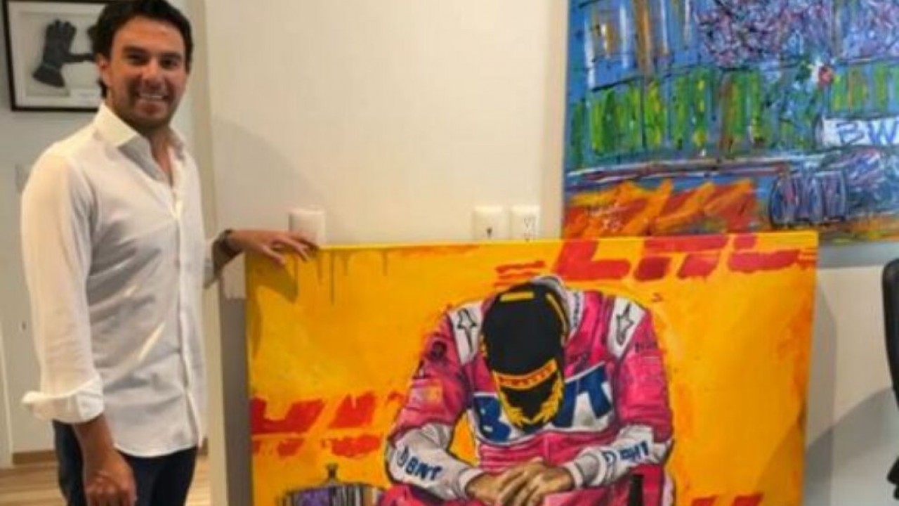 La obra inmortaliza la primera victoria en el Gran Premio de Sakhir en 2020, cuando conducía para Racing Point, y la pintora compartió el proceso en las redes, ganándose la admiración y que un familiar pidiera que ayudaran a que el mensaje llegara a “Checo”.