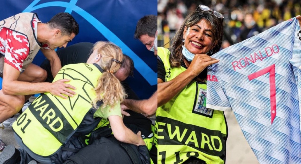 Cristiano Ronaldo dio un balonazo a una mujer del equipo de seguridad del estadio en el calentamiento del partido con el Young Boys y, tras el encuentro, le regaló su camiseta.