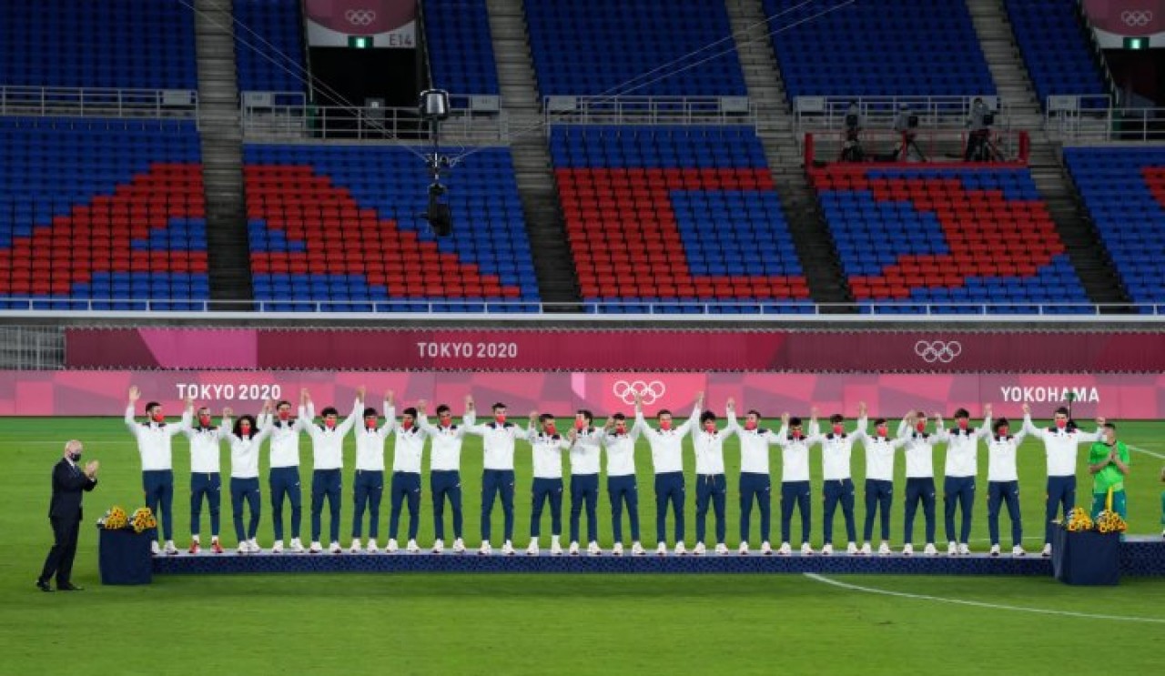 Los futbolistas españoles, serios pero enteros, recogieron las medallas que les entregaba en una bandeja Gianni Infantino, presidente de la FIFA, y se las fueron colgando unos a otros como es habitual en las ceremonias de podio en estos Juegos debido a las medidas de prevención de contagios de Coronavirus.