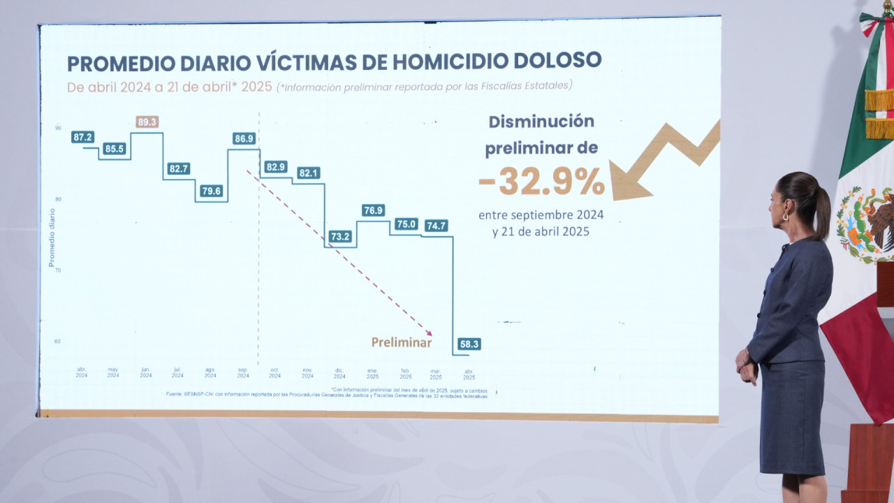 La Presidenta Claudia Sheinbaum Pardo resaltó que, gracias a la implementación de los cuatro ejes de la Estrategia Nacional de Seguridad, ha disminuido en 32.9 por ciento el promedio diario de víctimas de homicidio doloso entre septiembre de 2024 y el 21 de abril de 2025, de acuerdo con datos preliminares.