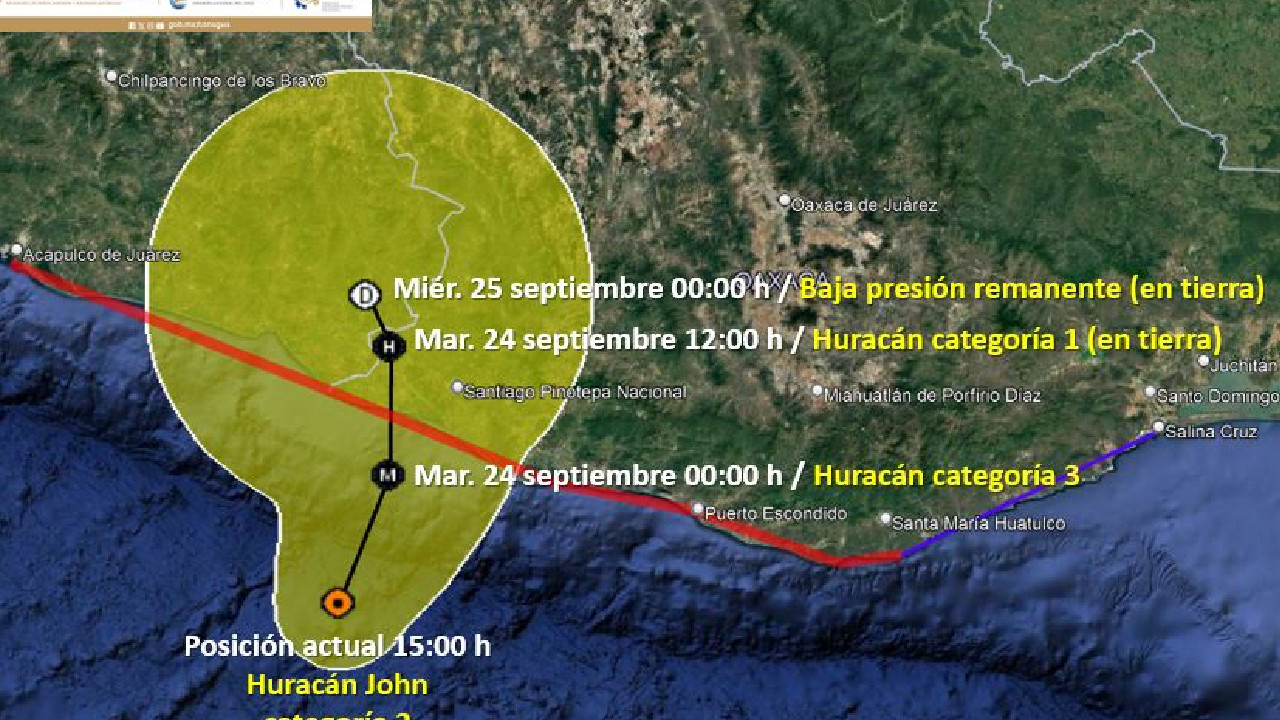Además, de acuerdo con su trayectoria, "John" tocaría tierra entre Santiago Pinotepa Nacional, Oaxaca y Copala, Guerrero, la noche de este lunes o la madrugada del martes.