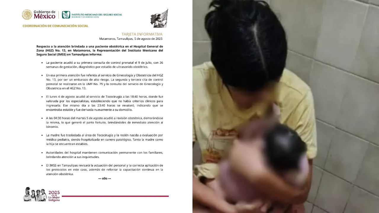 Una adolescente dio a luz sin atención médica en el baño de un hospital del IMSS en Matamoros, Tamaulipas, este martes 5 de agosto.