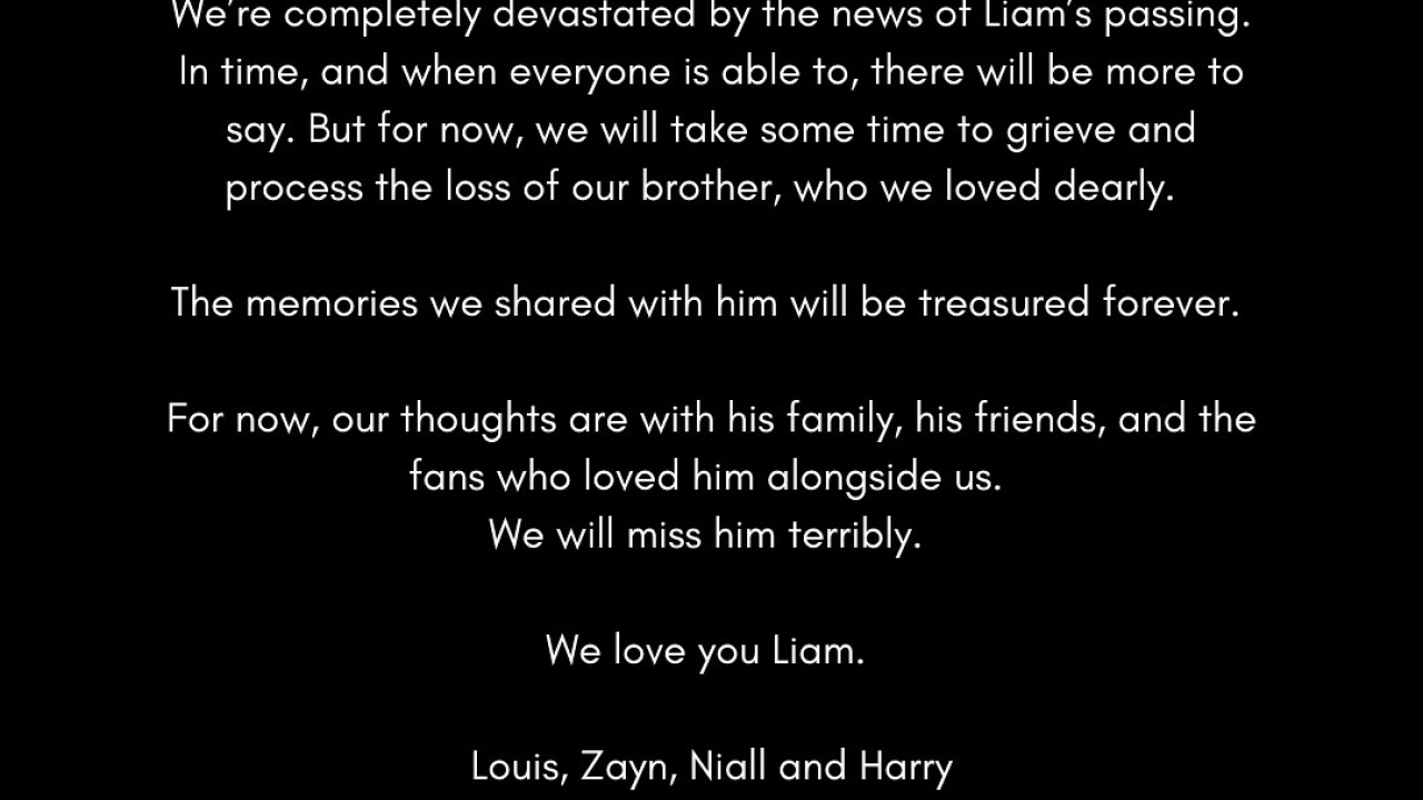 La página oficial de One Direction emitió emotivo comunicado tras el inesperado fallecimiento de Liam Payne, que refleja el sufrimiento por el que pasan sus compañeros.