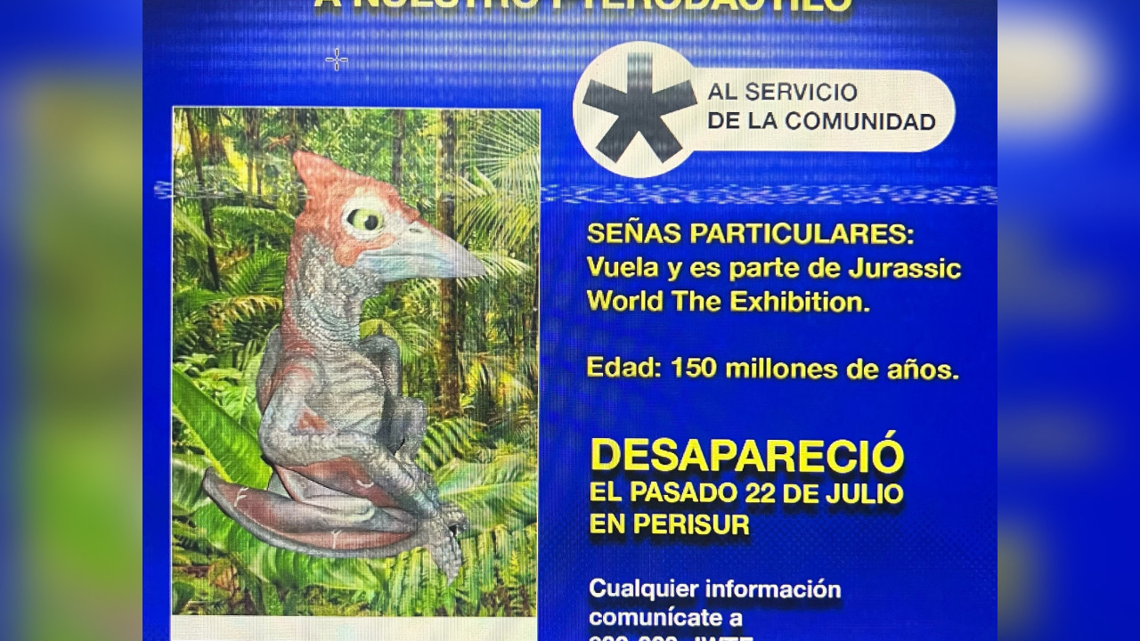Escenario Ocesa emitió este jueves una ficha de búsqueda por el dinosaurio de la Expo Jurassic World que se reportó como robado el pasado miércoles.