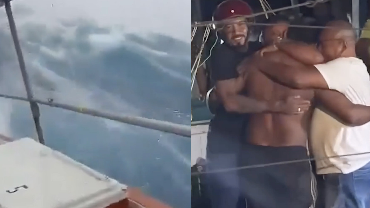 En imágenes que se hicieron virales, se ve a los hombres resistiendo el embate de las olas y la furia de la lluvia y el viento.