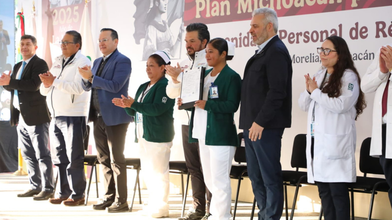 A través de un enlace desde Palacio Nacional a Morelia, Michoacán, la Presidenta de México, Claudia Sheinbaum Pardo, encabezó la entrega de basificaciones a 270 nuevos trabajadores de la salud: médicas, médicos, enfermeras, enfermeros y paramédicos, que se incorporan a hospitales rurales y de zona del Instituto Mexicano del Seguro Social (IMSS) como parte del Plan Michoacán por la Paz y la Justicia.