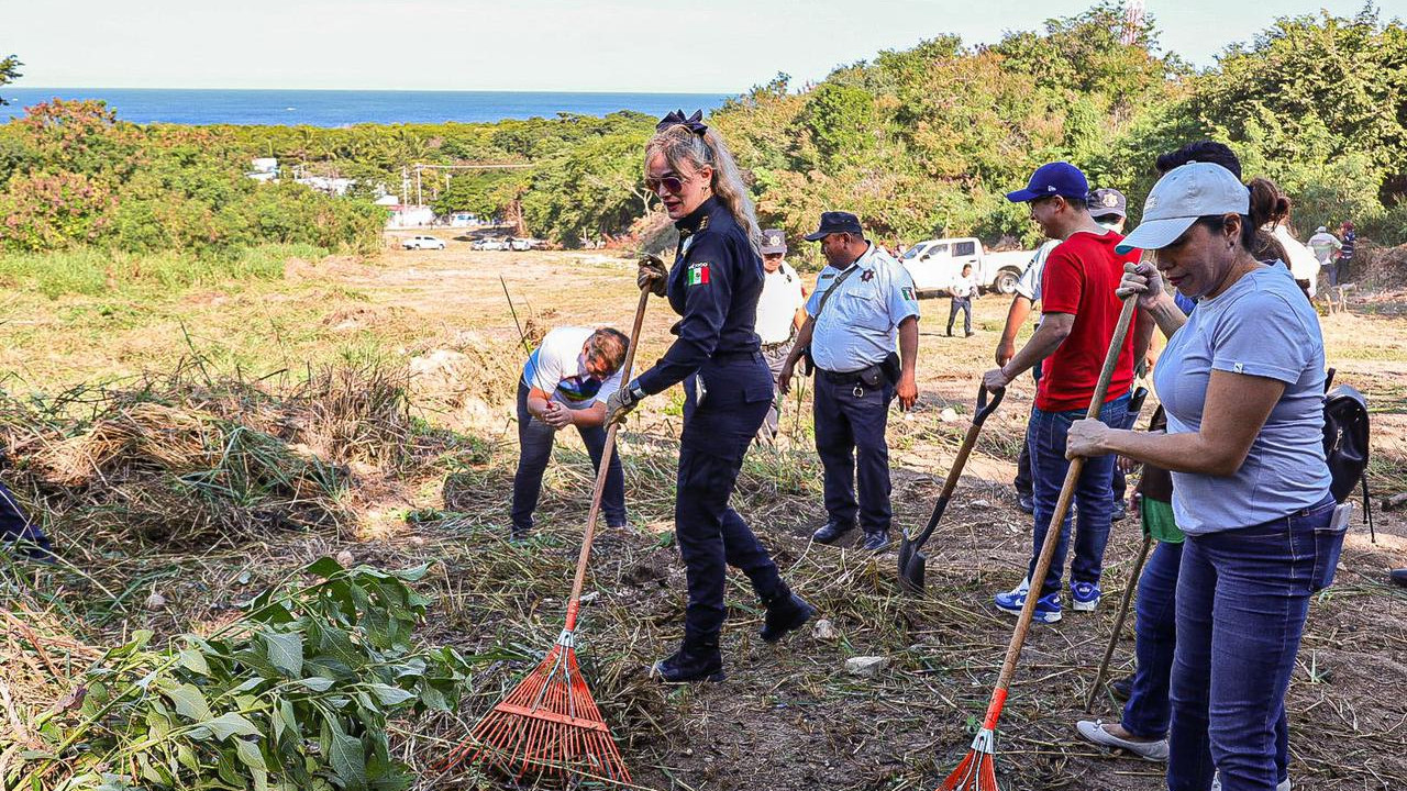Personal de la Secretaría de Protección y Seguridad Ciudadana participó en las labores de limpieza de espacio en la colonia Baluartes donde habrá el primer Sendero Seguro de la entidad.