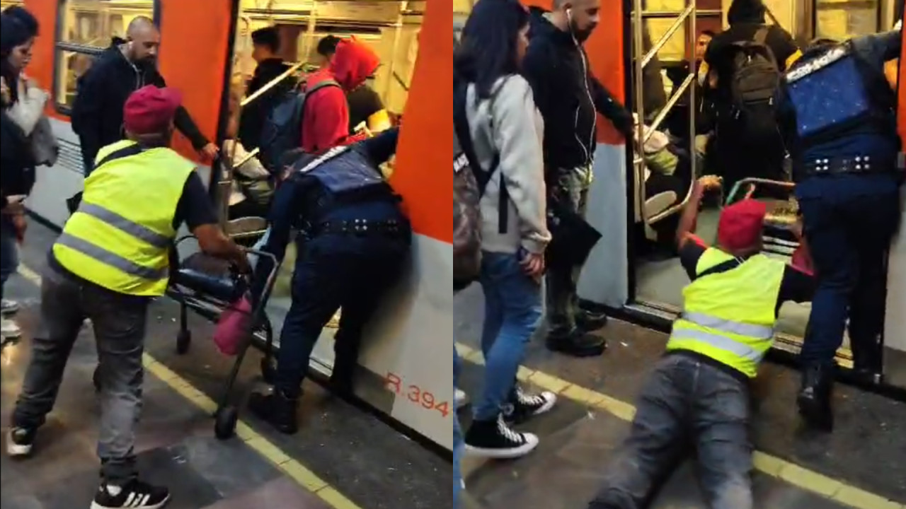 En el video se observa que el uniformado intenta ayudar a un hombre con una andadera a entrar a un vagón del Metro, sin embargo, un mal cálculo, hace que el sujeto termine en el suelo.