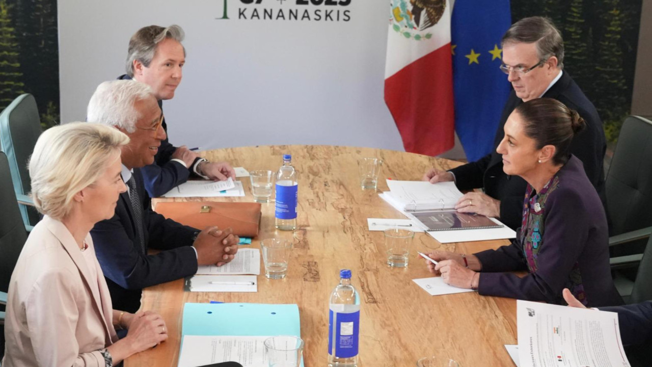 En el marco de la 51ª Cumbre de Líderes del G7, en Kananaskis, Alberta, Canadá, la Presidenta Claudia Sheinbaum Pardo sostuvo una reunión con el presidente del Consejo Europeo, António Costa, y con la presidenta de la Comisión Europea, Ursula von der Leyen, para dialogar sobre la actualización del tratado comercial entre México y la Unión Europea.