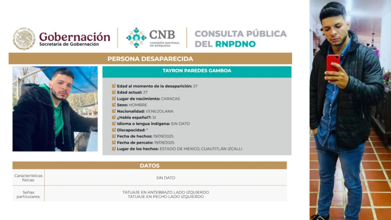 Tayron Gamboa, músico venezolano, fue reportado como desaparecido en el Edomex, entidad en el que hallaron los cuerpos sin vida de los artistas colombianos Byron y Jorge Luis, este lunes 22 de septiembre.