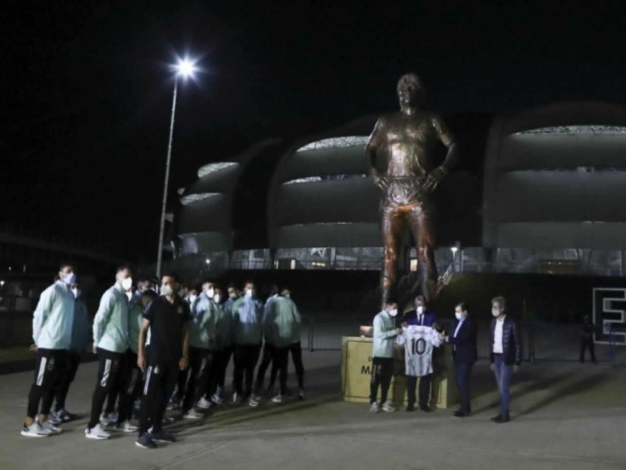 Previamente, al llegar al estadio Madre de Ciudades de Santiago del Estero, toda la plantilla albiceleste encabezada por Lionel Messi y Claudio Tapia, presidente de la AFA, develaron una estatua de cinco metros de altura y dos toneladas de peso de Diego Maradona. EFE