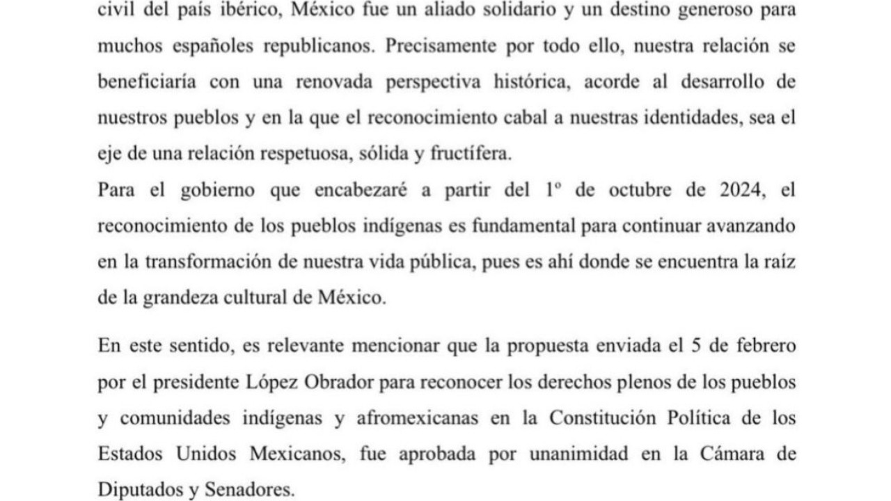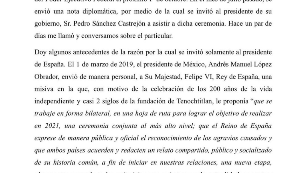 En comunicado, señaló que en 2019 López Obrador mandó una carta al soberano en el que le pidió de manera pública reconocer los agravios causados a nuestro país y, a partir de ahí, iniciar una nueva etapa.