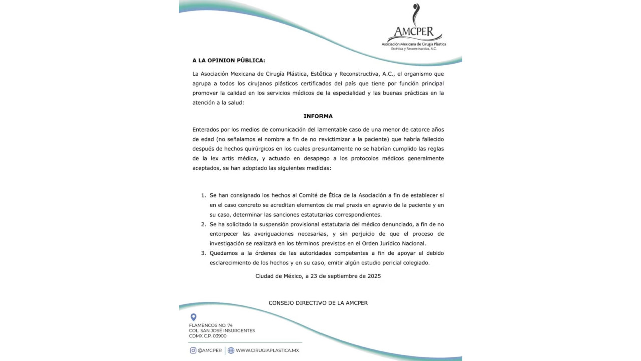 La Asociación Mexicana de Cirugía Plástica, Estética y Reconstructiva (AMCPER) solicitó la suspensión provisional de un cirujano acusado de operar a una menor, quien perdió la vida tras la intervención, el pasado 20 de septiembre en Durango.