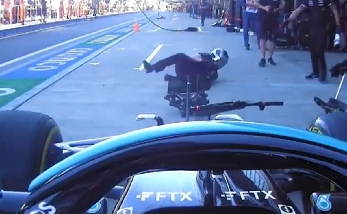 Pequeño susto por “accidente” de Hamilton con un mecánico